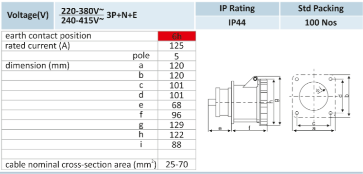 The 125A 5 Pin Angular Panel Socket is a high-capacity industrial connector built to deliver safe, efficient, and reliable power distribution for the most demanding applications. With a 125A current rating and 5-pin configuration, it supports three-phase power (L1, L2, L3) with neutral and earth connections, making it suitable for high-power equipment and large-scale electrical installations.