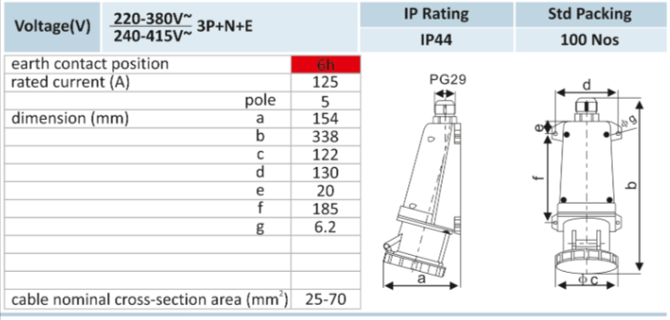 With a 125-amp rating, this wall socket is engineered to power heavy machinery, high-capacity chargers, industrial motors, and energy-intensive equipment. The robust housing is crafted from industrial-grade thermoplastic to withstand impacts, vibration, and harsh environmental conditions. This ensures reliable performance and long service life even in the most demanding applications.