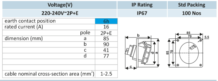 The 16A 3 Pin Angular Panel Socket IP67 is a reliable and durable industrial connector designed for applications requiring waterproof and dustproof protection. Built with heavy-duty materials, this panel socket ensures excellent electrical conductivity, long service life, and enhanced safety in harsh environments.