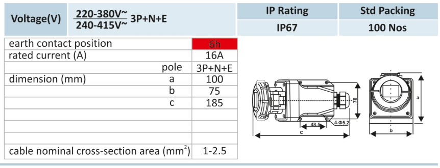With a 16A current rating, this wall socket is ideal for supplying medium-duty three-phase loads such as production equipment, motors, conveyors, and workshop tools. It is purpose-built to handle continuous operation without overheating or compromising safety, making it an excellent choice for manufacturing facilities, warehouses, construction sites, and commercial buildings.