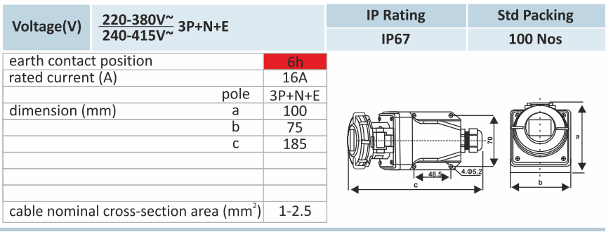 Rated for 32 amps, this heavy-duty socket is ideal for powering industrial machinery, production lines, mobile equipment, and large tools that require continuous and stable electricity. With its IP67 ingress protection, it offers complete dust-tight sealing and protection against immersion in water up to 1 meter, making it perfect for wet, dusty, and outdoor applications.